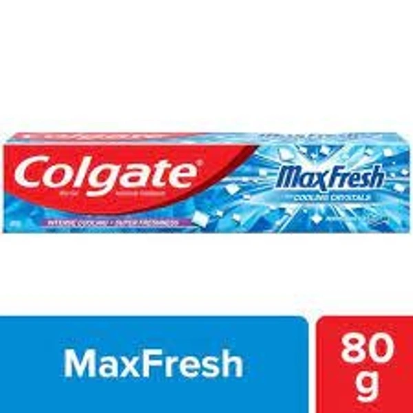 - This blue gel toothpaste contains unique cooling crystal that dissolve completely as you brush. Colgate Maxfresh gives you an icy wave of minty coolnessand an intense burst of freshness