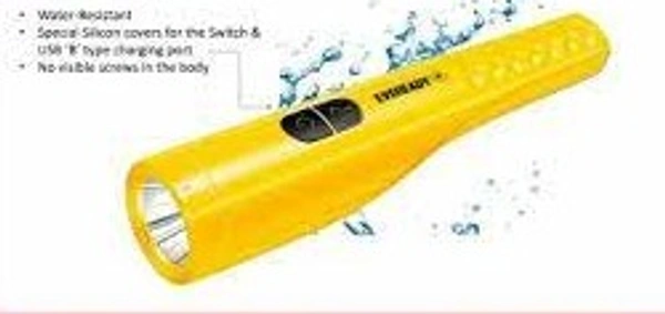 Dl90 Eveready Torch Mrpp 199 Fast charging in 3.5 hours โข Li-ion battery with 500 recharge cycles โข Overcharge Protection โข Deep Discharge Protection ECT Technology โ Charging & Full Charge Indicator โข On charging โ Light will blink โข On Full charge โ Light will be constant Light will be visible once charging port cover is opened & torch is connected to the charger A unique UNICORN design 8โ long Handheld torch 1 Watt Torch 2 Watt Side Light Splash-Proof (with a Silicon Cover for the Switch & Charging Port) 50% LESS CHARGING TIME โ Fast Charging in 3 Hours 4 LIGHTING MODES โ Torch, Auto-Flasher, Side Light High & Dim ECT TECHNOLOGY โ Charging & Full Charge Indicator 4 Lighting Modes 1 Watt Torch & 2 Watt Side Light โข Torch โ 3 hours lighting time โข Auto-Flasher Side Light High Mode โ 3 hours lighting time โข Side Light Dim Mode โ 6 hours lighting time โข 8 inch long hand held torch โข Ergonomic grooves โข Super Sleek design โข Strong & Durable ABS Plastic Body Water-Resistant โข Special Silicon covers for the Switch & USB โBโ type charging port โข No visible screws in the body