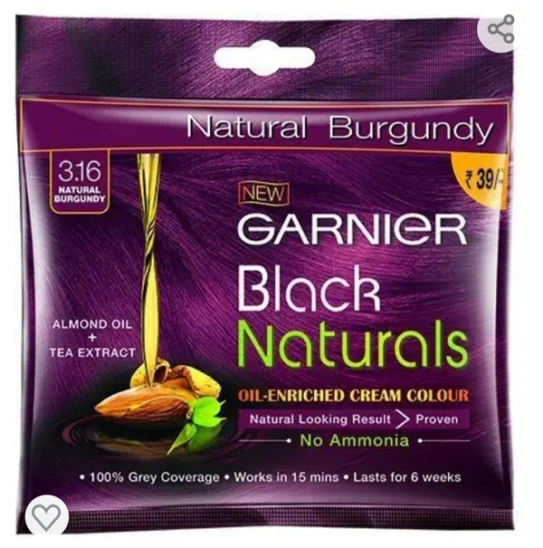 Enriched with the goodness of almond oil and black tea extract, Garnier Black Naturals is a no-ammonia Creme formula that works in just 15 minutes, covers 100% greys and lasts upto 6 weeks.