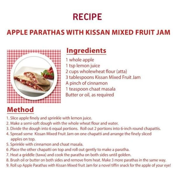 All your favorite fruits come together in Kissan Mixed Fruit Jam. A medley of flavours from 8 fruits such as Banana, Papaya, Apple, Pear, Pineapple, Mango, Grape and Orange blended in to one lip smacking jam. Kissan jam is the best jam with the goodness of your favorite 8 fruits. Kissan Mixed Fruit Jam is best partnered with bread to provide yummy on the go breakfast for your kid every morning. Think of different ways to eat it in. Spread it on a crunchy cracker, roll it up in a chapatti, drink it stirred in milk or whip up a bread and Jam delight for your kids' breakfast with an assortment of flavours. Started in 1934, Kissan is a popular brand in India. Kissan is more than just jams, ketchups and squashes. It's all about kids eating happily & growing up happily. Kissan Jam's yummy and fruit based sweet spread keeps both, mothers & kids happy. The brand's reassurance to mothers is that they can make breakfast times fun yet wholesome every morning with the Kissan range of fruit jams that are made with 100% real fruit ingredients! Remember craving something utterly sweet? This is your answer to that in a packed sweet spread bottle.