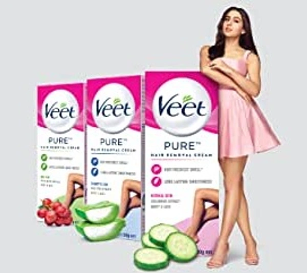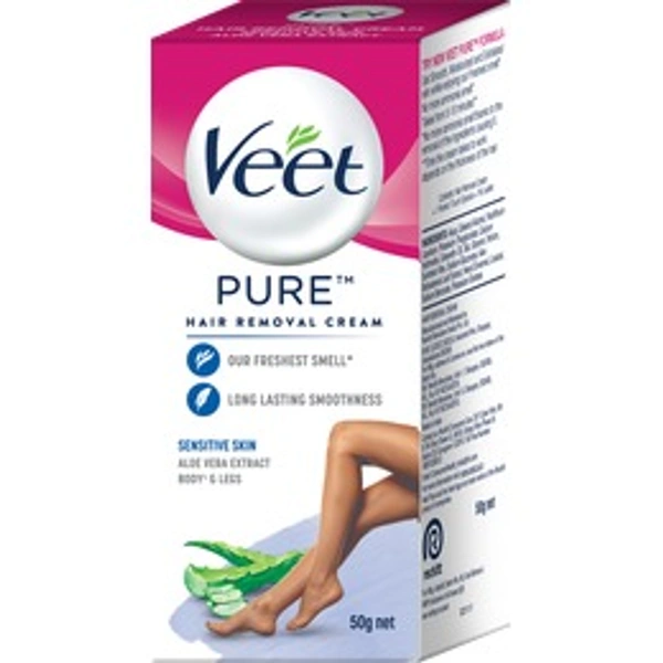 Get the smooth skin and the freedom to wear any look, any time with Veet. Veet Pure Hair Removal Cream for Sensitive Skin, enriched with Aloe Vera, is the right solution when going to the salon is not an option. It effectively removes even short stubborn hair and leaves skin moisturized for up to 24 hours*. It can be used on legs, arms, bikini lines and underarms for a perfectly finished smooth, moisturized and exfoliated skin. Veet Pure Hair Removal Cream for Sensitive Skin gives you perfect hair removal results in just 5-10 minutes. Follow the steps mentioned on the pack using the spatula provided. Before using the product, please read pack precautions carefully. With regular use; get fewer, finer and softer hair growing back!